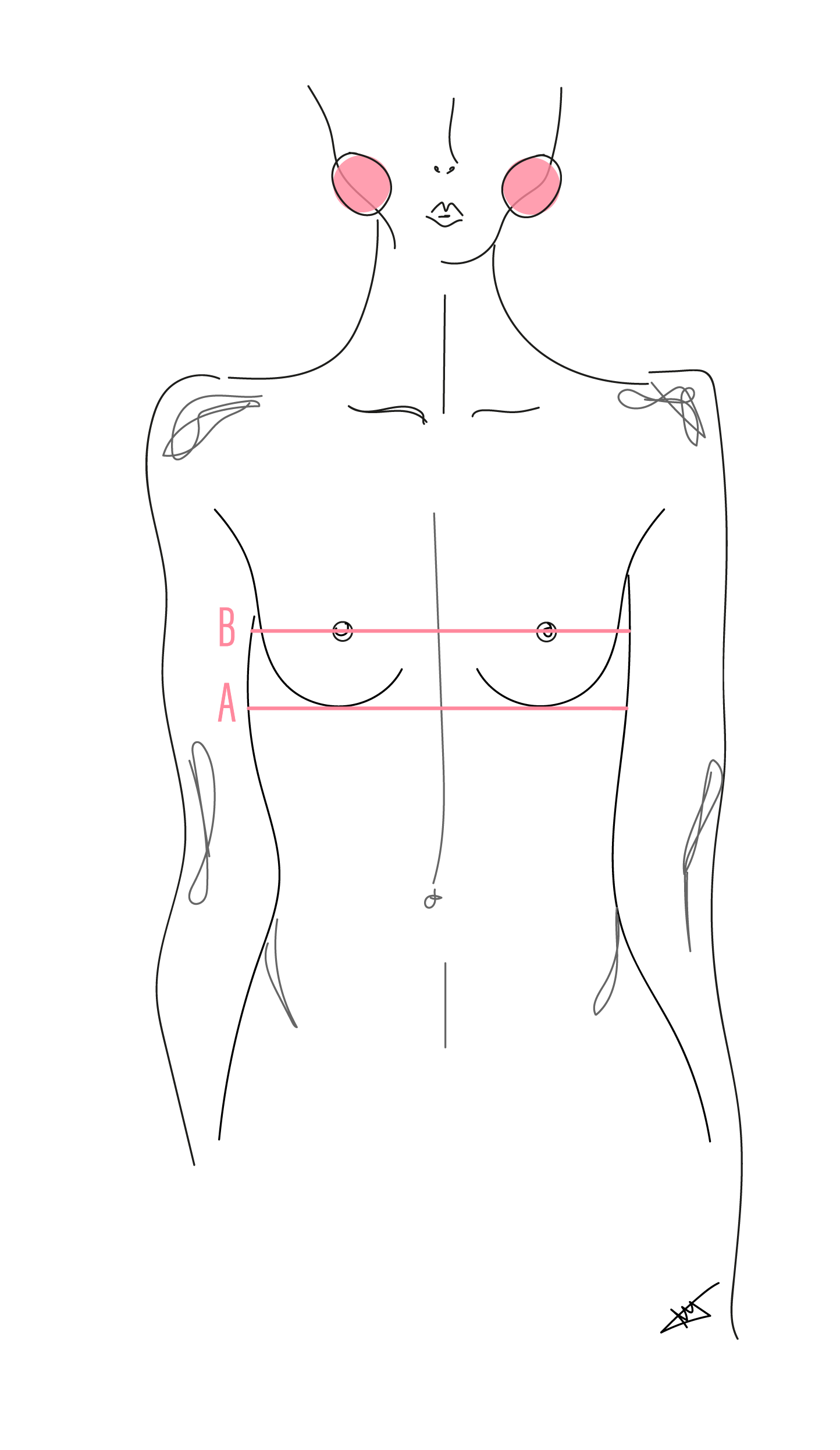 Prenez la mesure de votre dessous de taille (A), et de votre tour de poitrine (B) sans serrer à l'aide d'un mètre ruban.
