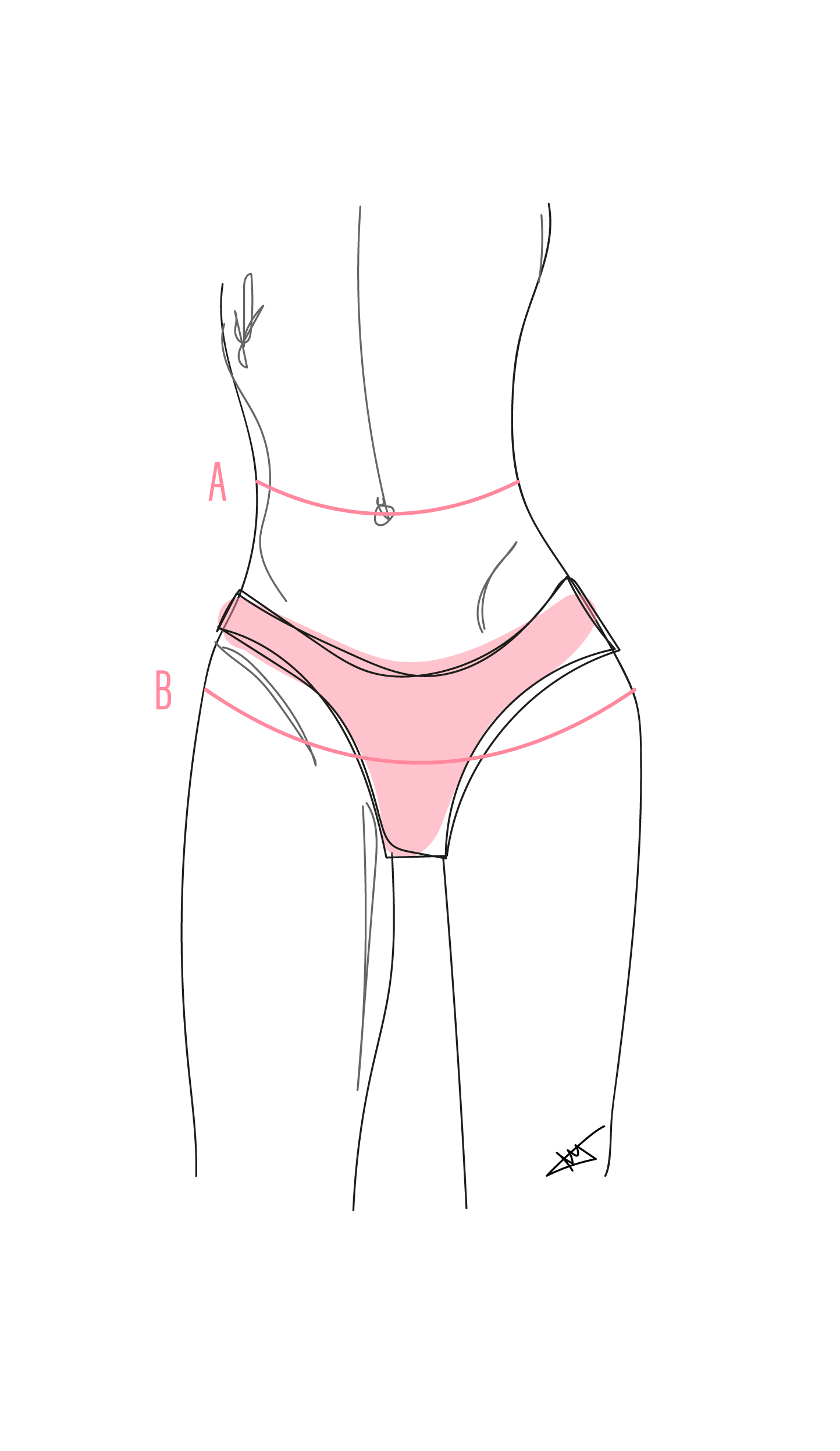 Retrouvez la taille qu’il vous faut en fonction de votre tour de taille (A) et de hanches (B) dans le tableau ci-dessous. Si vous êtes entre deux tailles, je vous conseille de prendre la taille supérieure pour être plus à l'aise.